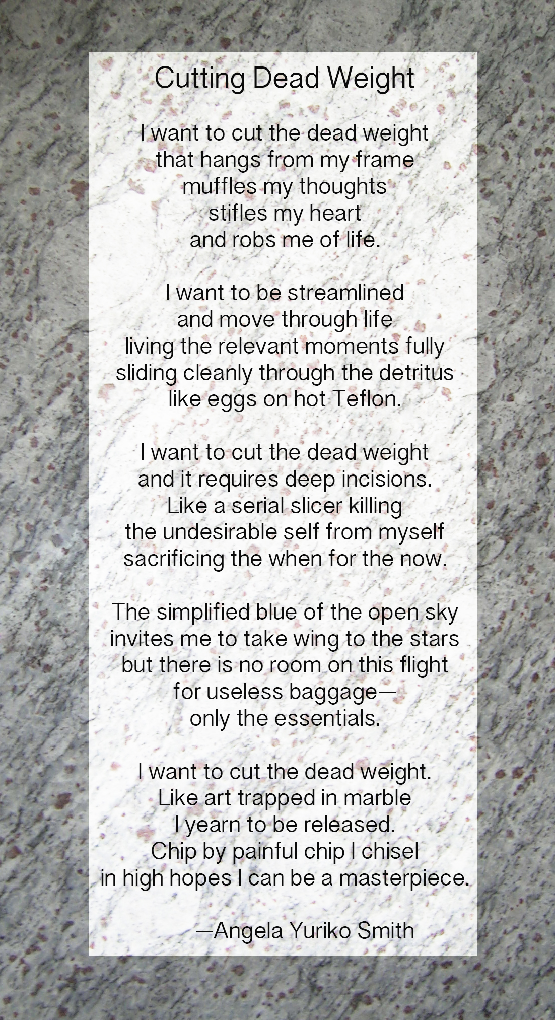 And now… because it’s National Poetry Month and I’m trying to highlight poetry all month long… here is the poem I wrote back when I first lost my own 50 pounds. It was published in my collection, In Favor of Pain.