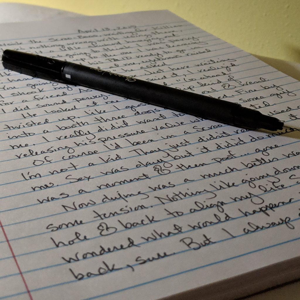 Cue the scary music because that’s how it felt. I was alone in a dark house with nothing to record my thoughts but a fine tipped Sharpie and a spiral notebook. In my world, pens are for signing books, not writing them.